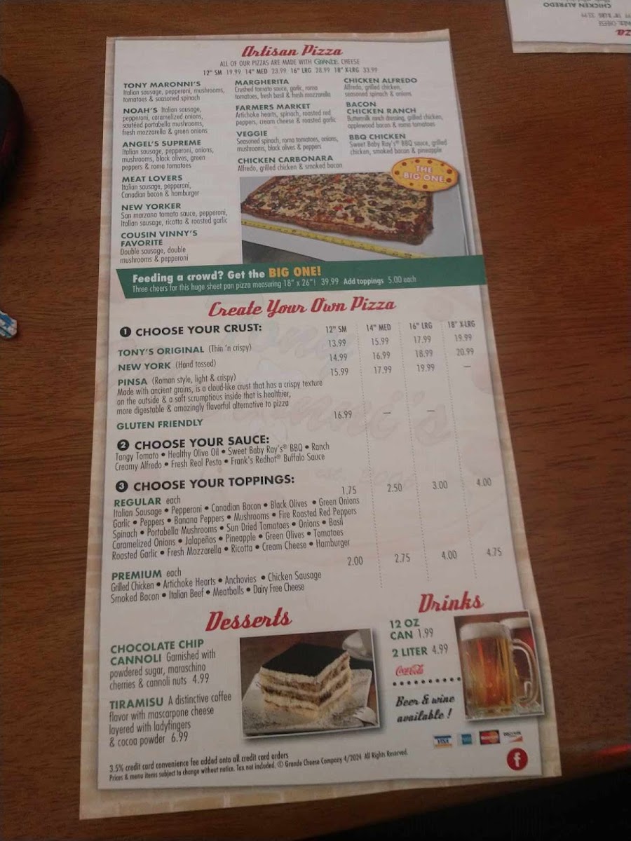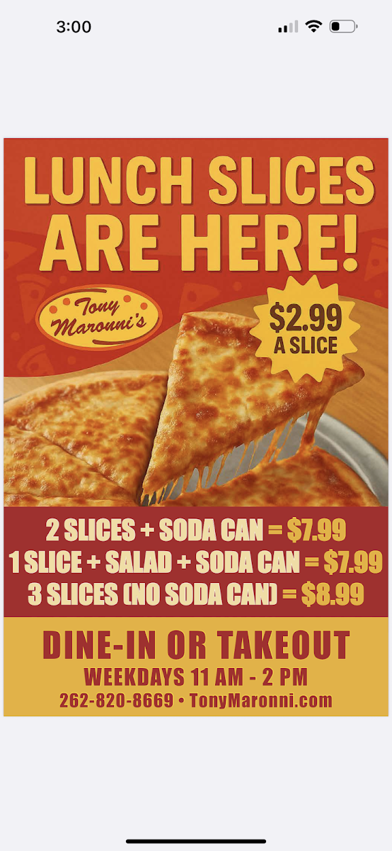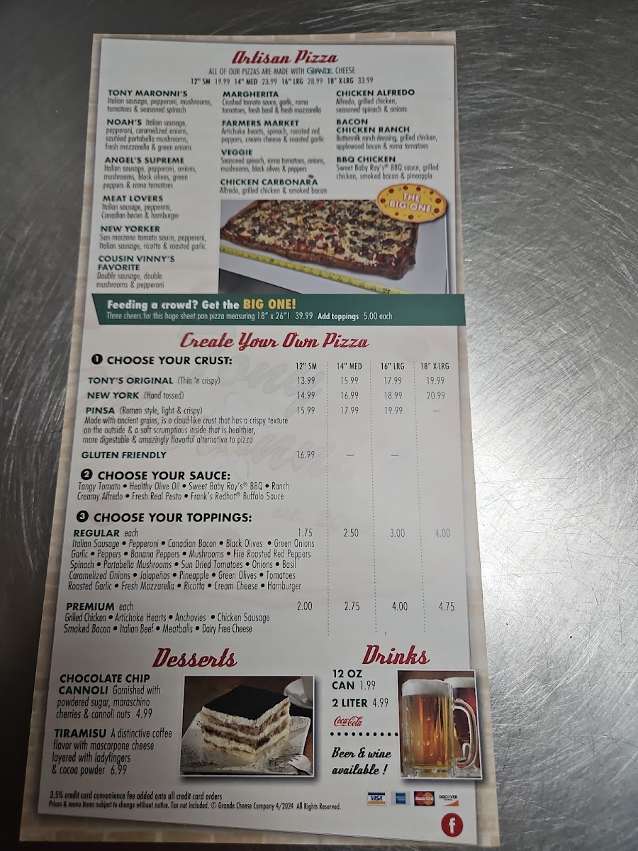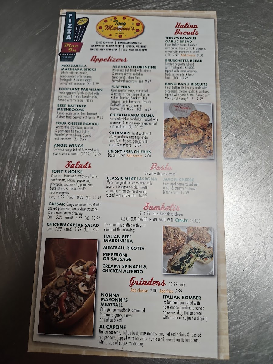 Complement your meal with fresh salads such as Caprese or Caesar, or indulge in Tony’s famous garlic bread and house-made Pinsa dippers—great for sharing or a light snack. Refreshing lemonade and other casual drinks round out a menu designed to fit the warm, inviting atmosphere of a neighborhood spot where good food and relaxed moments come together.